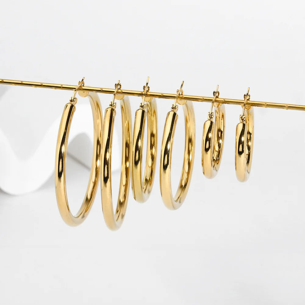 Add a touch of luxury to your accessory collection with our 18k Gold Plated Statement Hoop Earrings. Made of tarnish-resistant stainless steel, these earrings are perfect for women, teenagers, and girls. Elevate any outfit with these chic and stylish hoops that will never lose their shine!