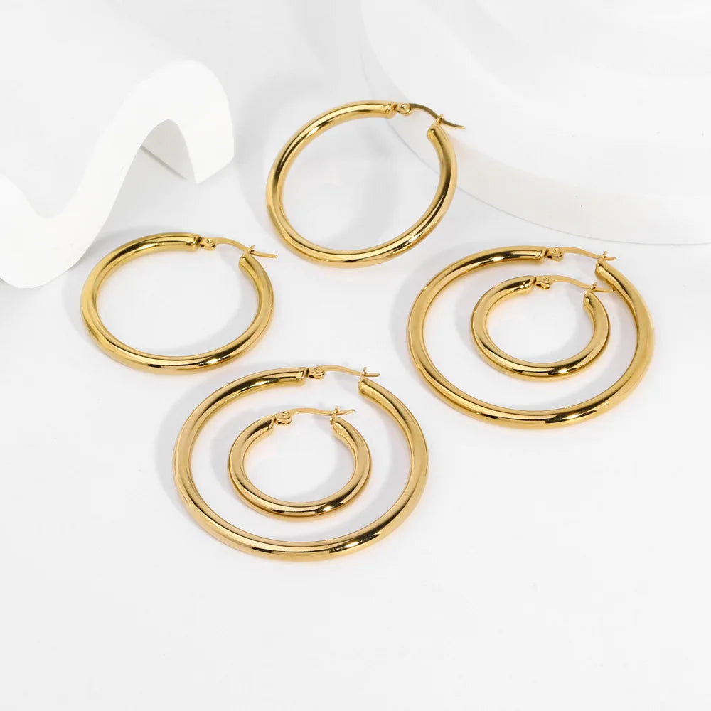 Pair these 18k Gold Plated Stainless Steel Luxury Statement Circle Hoop Earrings with a simple top for an effortlessly chic look or dress them up with evening wear for a more glamorous appearance. Their geometric design adds a modern twist, making them a perfect accessory for any fashion-forward individual.