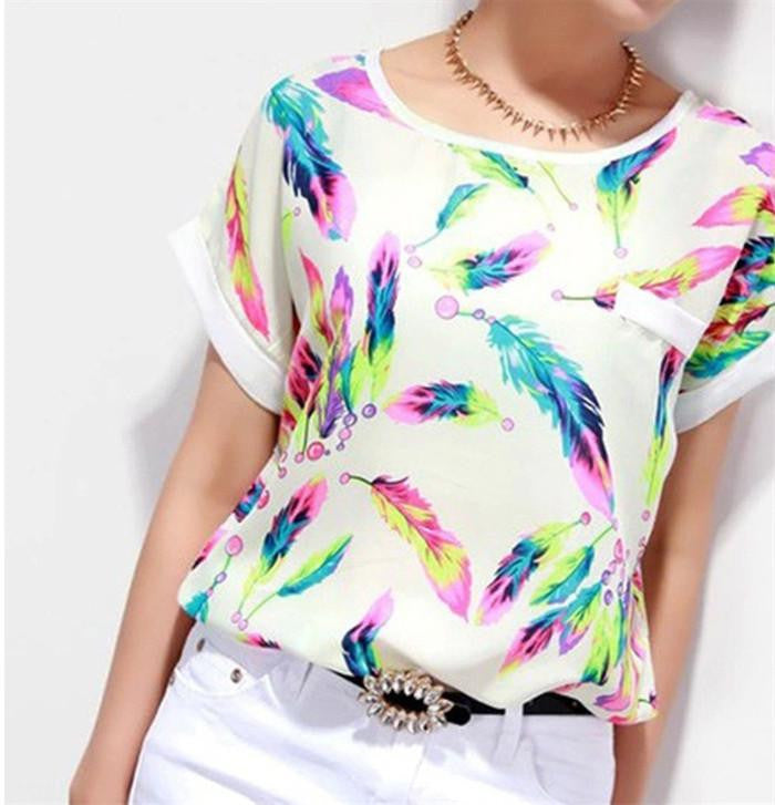 Introducing the Women Chiffon Blouses Tops Ladies Loose Short Sleeve Feather Printed Blouse & Shirts Plus Size, your perfect companion for effortless elegance this season. Crafted from a lightweight chiffon fabric, this blouse promises both comfort and style, making it an essential addition to your wardrobe. The loose fit allows for easy movement and breathability, ensuring you feel confident and chic all day long.