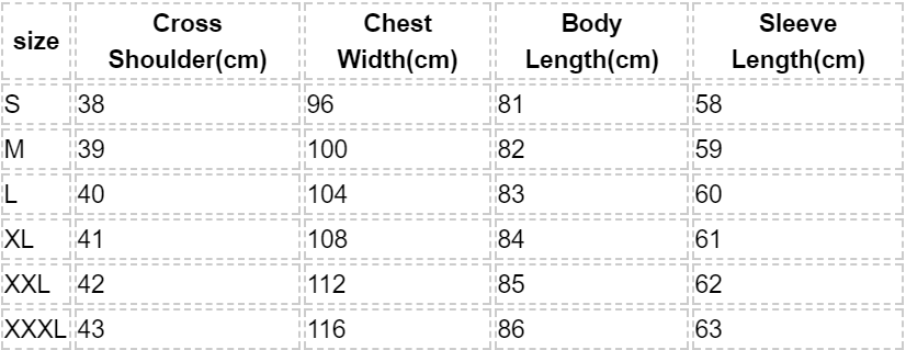 size | Cross Shoulder(cm) | Chest Width(cm) | Body Length(cm) | Sleeve Length(cm) |