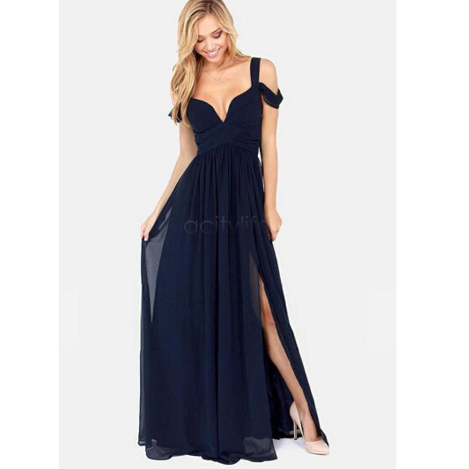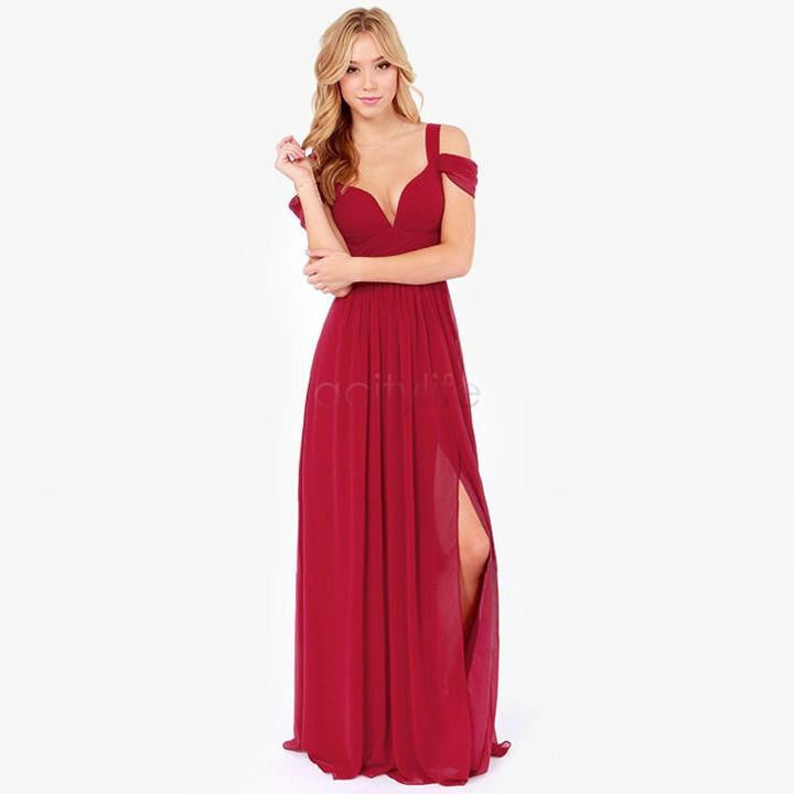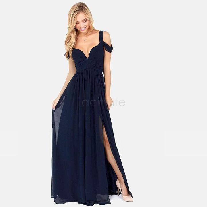 Look sexy this summer with this almost off the shoulder long flowing chiffon dress. This deep side slit adds sophistication and elegance to this piece. Order your beautiful chiffon gown now.