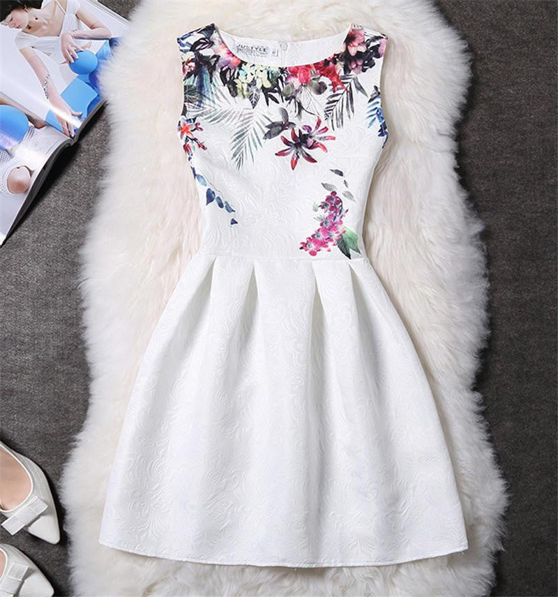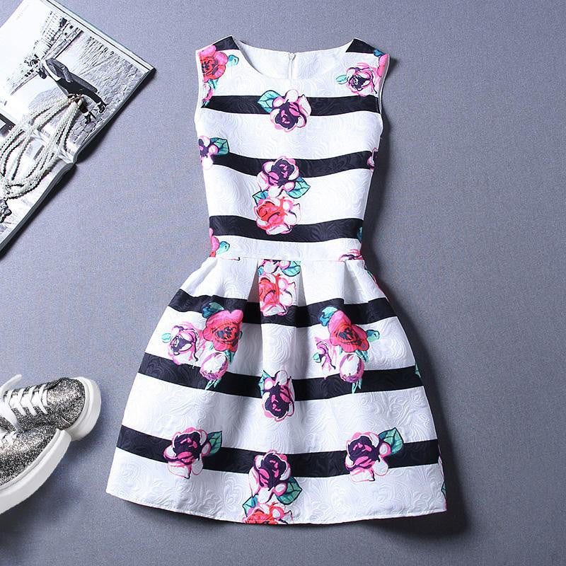 Look absolutely stunning and sexy in this beautiful printed floral dress. This dress accentuates your waistline with a nstural neckline and sleeveless look. Look and stunning in this knee length piece.