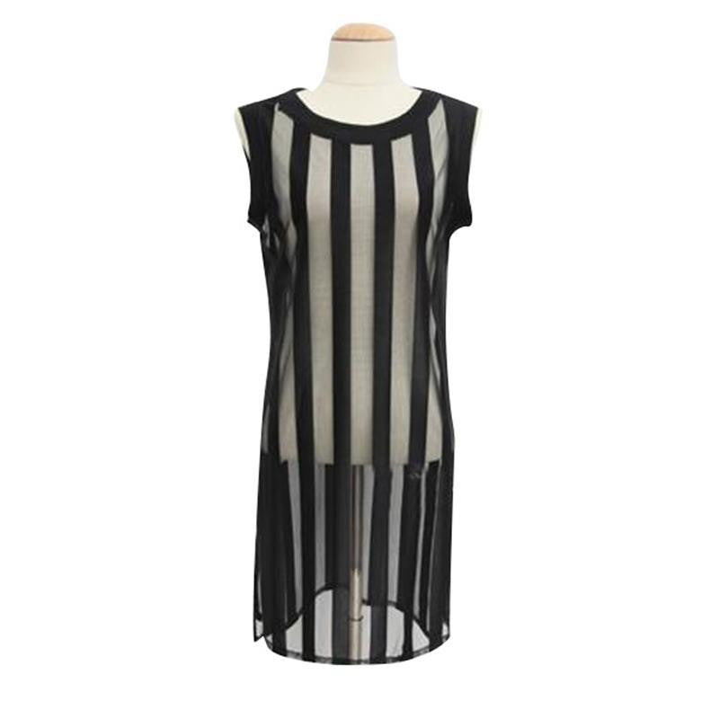 Whether you're dressing up for a night out or keeping it casual during the day, this top can be easily styled to suit any occasion. Its natural color style complements any outfit, making the Sleeveless Mesh Sheer T Shirt Women Tops and Tees Long Striped Top an essential piece for effortless styling year-round.
