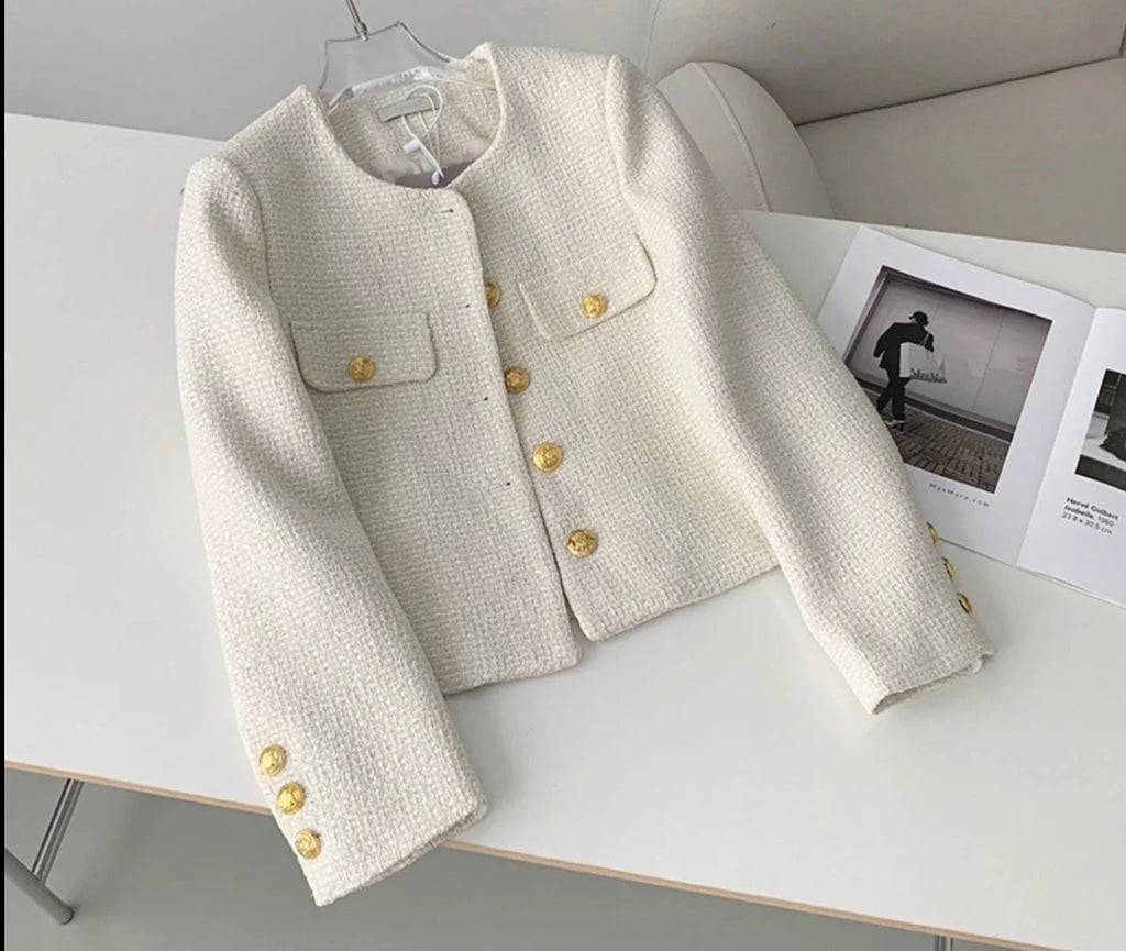 Available in elegant shades of white, green, and black, this tweed jacket seamlessly pairs with high-waisted jeans, skirts, or tailored trousers. Whether you're dressing up for the office or going out for a casual lunch, this coat is versatile enough to suit any setting.