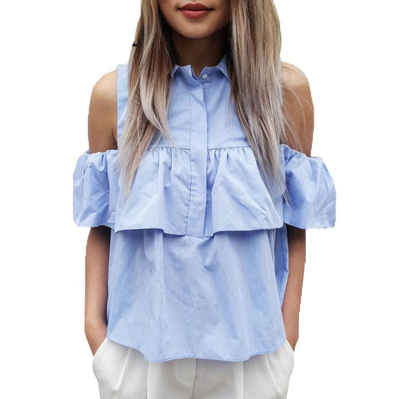 Don’t miss out on this must-have addition to your closet. Order your Women Casual Cold Shoulder Ruffles Blouse Shirts Turn Down Blue Casual Tops Ladies today and experience the blend of style and comfort!