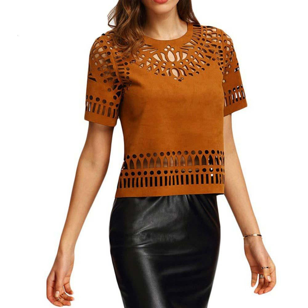 This Women Ethnic Cut Out Faux Leather Suede Back Zipper Hollow Out Short Sleeve Tshirt Top Female pairs beautifully with jeans, skirts, or shorts, making it a versatile addition to any closet. Dress it up with accessories for a night out or keep it casual for a day of errands.