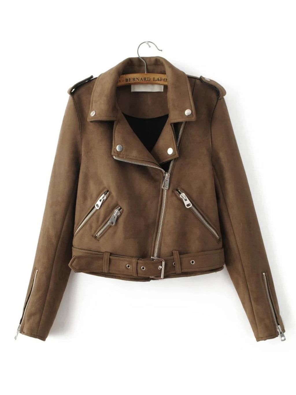 Crafted from high-quality polyester, this faux suede biker jacket features a trendy turn-down collar and a sleek zipper closure. The solid khaki gray color adds a touch of sophistication, making it an essential layering piece for any outfit. Whether you're heading out for a casual day or a night on the town, this jacket will elevate your look.