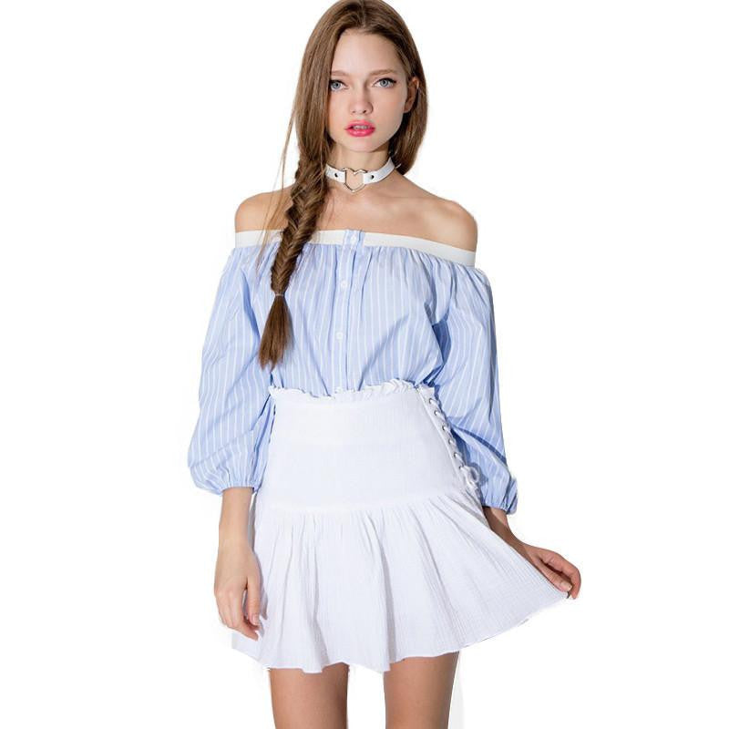 Order your Womens Off Shoulder Lantern Sleeve Striped T-shirt Loose Slim Pleated Button Basic Tops Tees for today and embrace a stylish, comfortable, and confident you!