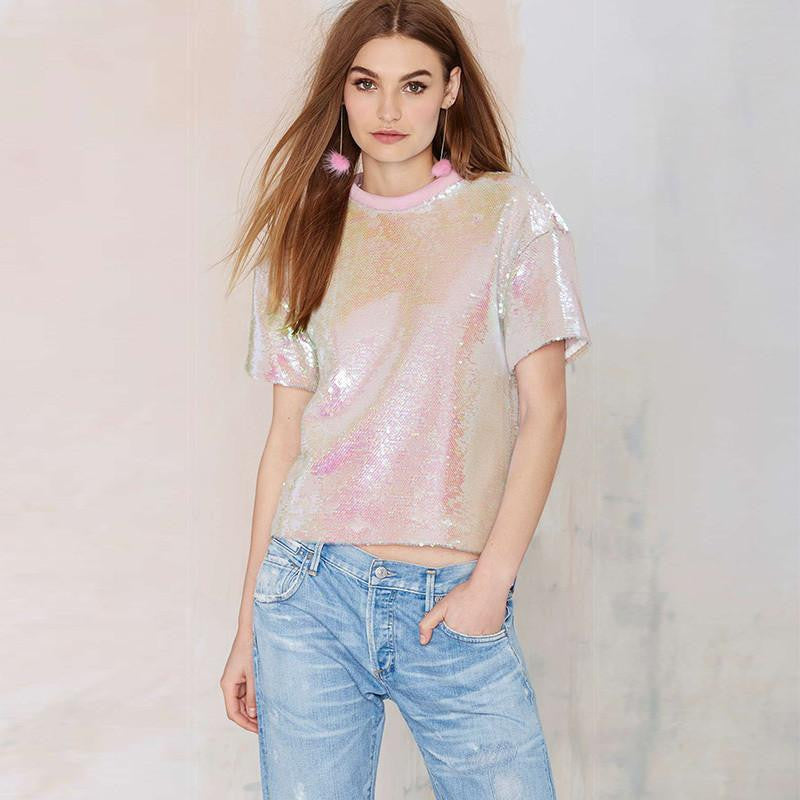 Upgrade your casual style and shop the Women Pink Sequined Ribbing T-shirts Loose O-neck Short Sleeve T-shirt today. Experience the perfect blend of style and comfort with each wear, and make a statement no matter where you go.