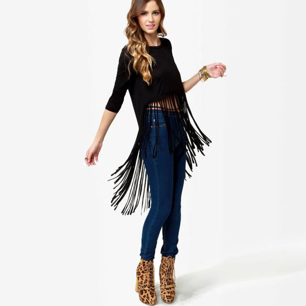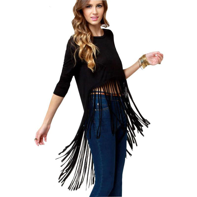 Feel confident and stylish with the Womens Irregular Tassel Black Tops Three Quarter sleeve Female Fashion T-shirts. For more detailed sizing information, please contact us. Upgrade your fashion game today!