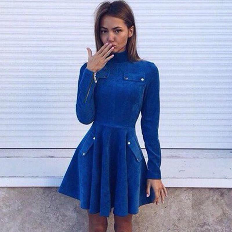 Get this beautiful blue long-sleeve dress with zippers at the end of the sleeve this season.Get this high neckline mini flare dress for the season.