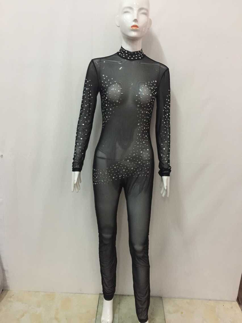 This Black Mesh Jumpsuit Rhinestone Romper Long Sleeve Sheer See Through Bandage Bodysuits Woman Bodycon Outfits is not only visually appealing but also comfortable for all-day wear. With a full-length design and skinny fit, this jumpsuit is perfect for women who want to showcase their style without sacrificing comfort.