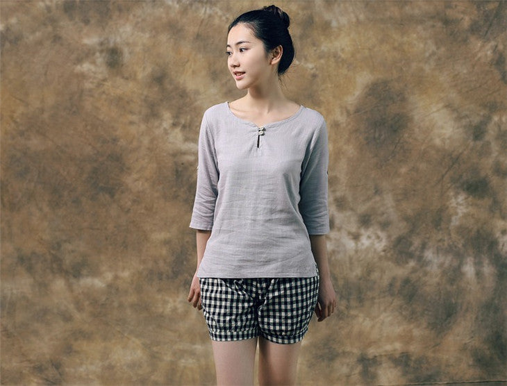 With its classic O-neck collar and three-quarter sleeves, this shirt exudes sophistication while providing a relaxed fit. The solid pattern and natural color make it easy to pair with your favorite trousers or skirts, ensuring you always look effortlessly chic.