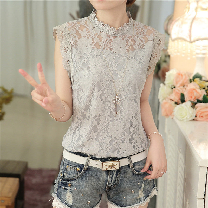 Fashion Loose Sleeveless White Gray Female Blouse Slim Elegant Lace Women Shirt Plus Size