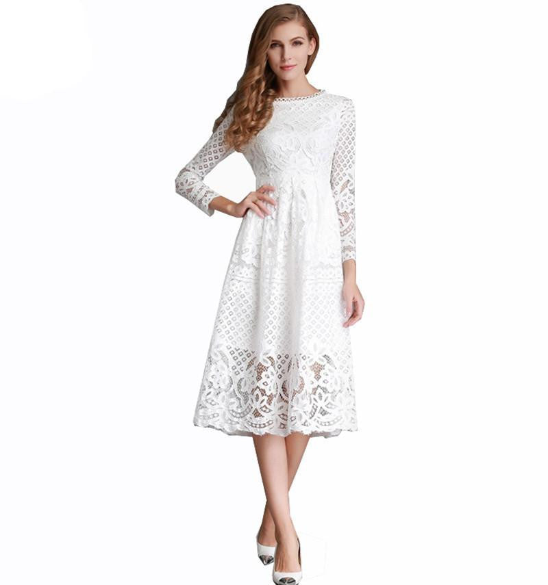 The Women White Lace Hollow Out Long Dresses Femme Casual Clothing Women's Slim Party Dress not only enhances your beauty but also provides unmatched comfort. Its solid bottom complements the intricate lace details, making it a standout piece in your wardrobe. Whether you're dancing the night away or enjoying a casual day out, this dress will keep you looking fabulous and feeling confident.
