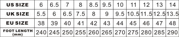 These shoes come in various sizes: 39, 40, 41, 42, 43, and 44. For personalized sizing information, please contact us.