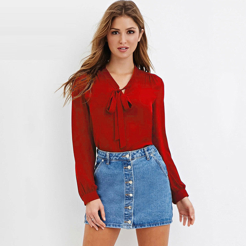 Elevate your wardrobe with our Women Fashion Casual Blouses Shirts Full Sleeve Bow Solid V-Neck Blouse. This stylish blouse is designed for women who appreciate a blend of comfort and elegance. Made from high-quality polyester, it offers a soft feel against the skin while ensuring durability. Its solid color pattern makes it versatile, allowing you to pair it effortlessly with jeans, skirts, or shorts for any occasion.