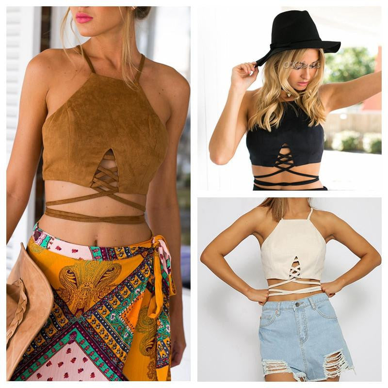 This Women Faux Suede Halter Cross Hollow Boho Bohemian Bandage Camis Women's Bustier Bralet Cropped Top Vest is a must-have for those who love to express their unique style. Whether you’re going for a casual look or dressing up for a night out, this top will keep you looking chic and fashionable. Don't miss out on the chance to refresh your wardrobe with this trendy piece!