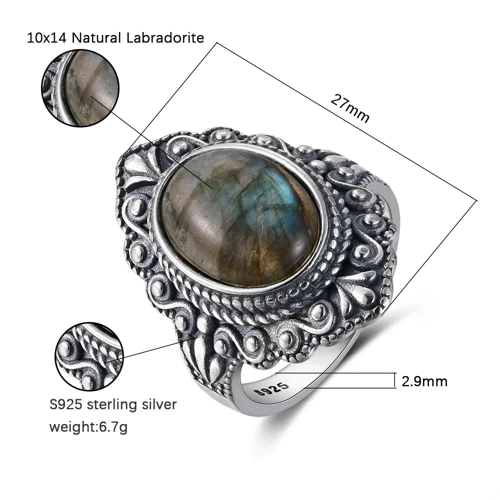 Enhance your jewelry collection with the stunning Oval Natural Labradorite Rings Women Men 925 Sterling Silver Ring Finger Ring Retro Gemstone Rings Jewelry Party Gift. Crafted from high-quality 925 sterling silver, this exquisite ring features a mesmerizing oval-shaped labradorite gemstone that captures light and creates a captivating play of colors. This unique piece is perfect for both men and women, making it a versatile addition to any wardrobe.
