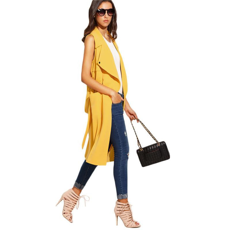 Whether you're layering it over a casual dress in the summer or wearing it as an outer layer in cooler months, the Women Casual Long Trench Coats Ladies Plain Yellow Sleeveless Lapel Tie Waist Knee Length Outerwear is your go-to solution for all-weather styling. Elevate your fashion game and embrace your individuality with this stunning coat today!