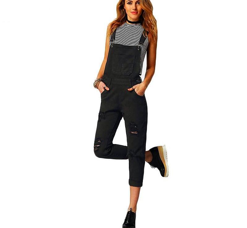 The Jumpsuit Denim Overalls Black Strap Ripped Pockets Full Length Women Jeans Jumpsuit is more than just a piece of clothing; it’s a fashion statement. Pair it with your favorite sneakers for a laid-back look or dress it up with heels for a night out. The solid pattern ensures it remains a timeless addition to your wardrobe.