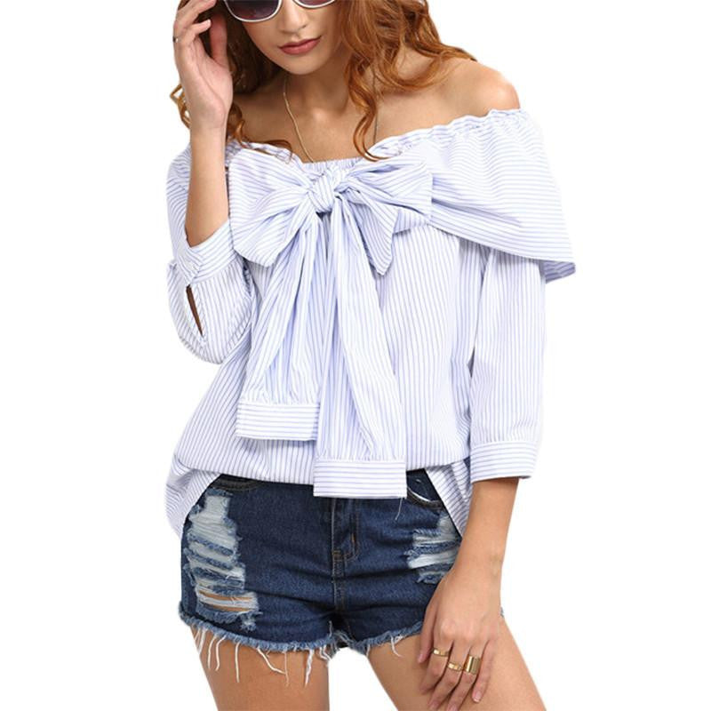 Step out with confidence in the Women Cute Tops Blue Striped Bow Off The Shoulder Blouses Style Casual Shirts Ladies 3/4 Sleeve Blouse. Don't miss out on this perfect blend of fashion and functionality—add it to your cart today!