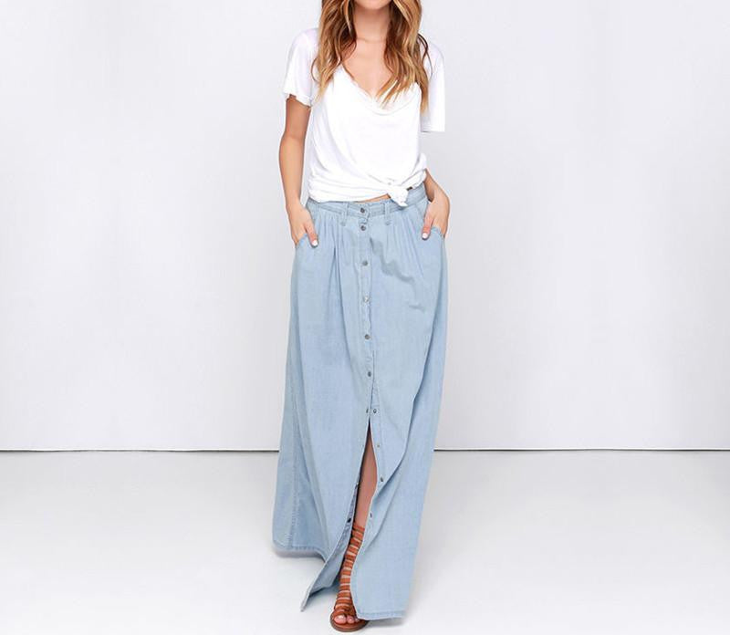 Embrace effortless style and make a statement with the Women Long Denim Skirt Casual Loose High Waisted Single Breasted Maxi Jean Skirt. Ideal for any occasion, this skirt not only enhances your look but also offers supreme comfort. Don't miss the chance to elevate your wardrobe with this timeless piece!