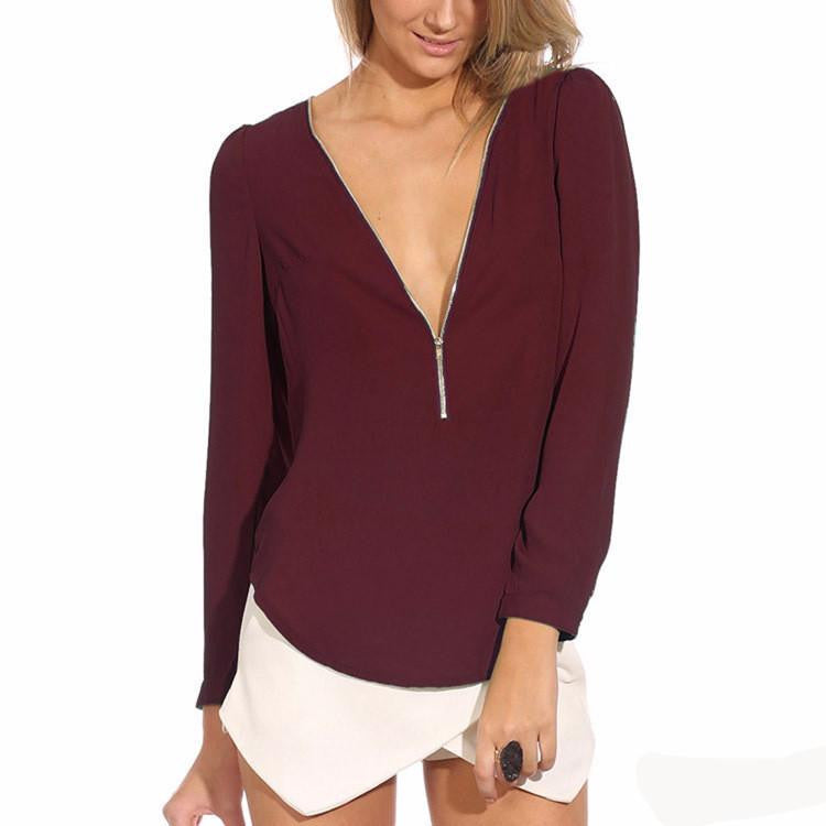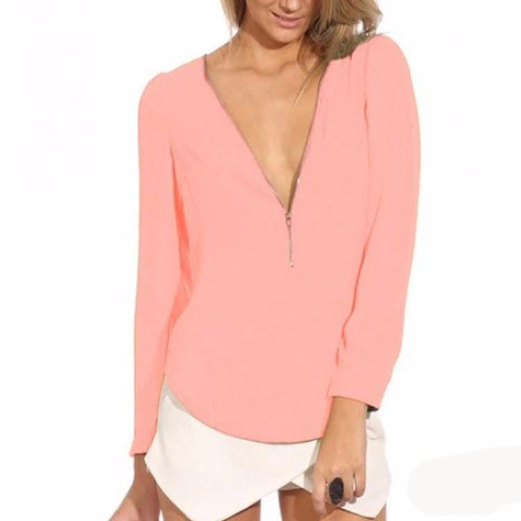 The Style Candy-colored Zipper V-neck Long Sleeve Causal Women Chiffon Blouse 6 Colors WF-9175 seamlessly transitions from day to night, making it the ideal choice for work, brunch, or dinner dates. Its solid pattern enhances its versatility, allowing it to be layered or worn alone with striking effect.