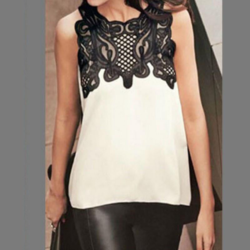 This amazing top is perfect for the summer days. The lace patchwork adds elegance and style to this piece. With its sleeveless outlook, this black and white top seems like the perfect little O- neck top.