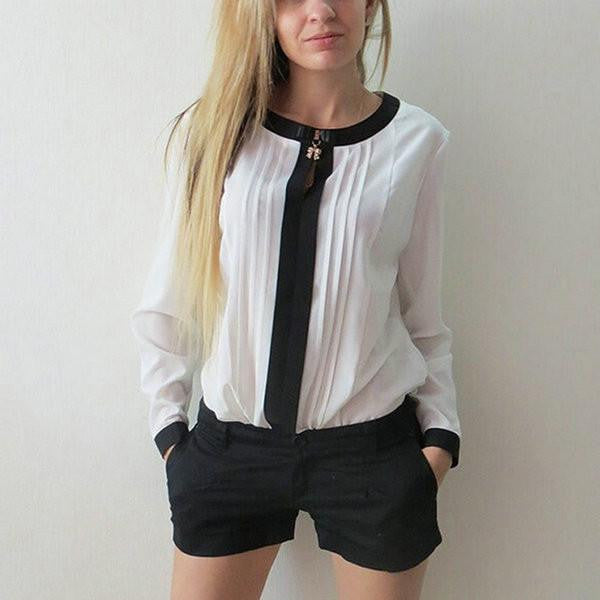 Introducing the Womens Long Sleeve Shirt Chiffon Pleated Patchwork Office Blouses Tops, the perfect fusion of elegance and professionalism. Crafted from high-quality chiffon, this stunning blouse features a charming pleated front that enhances its appeal while ensuring comfort and breathability. Whether you're heading to the office or a business meeting, this long sleeve blouse will elevate your wardrobe and make a lasting impression.