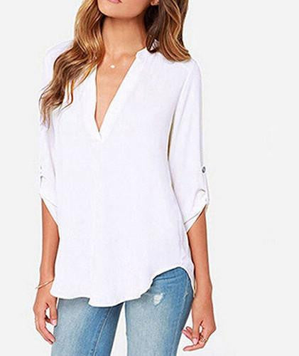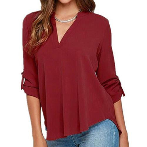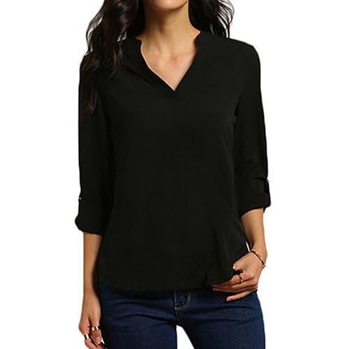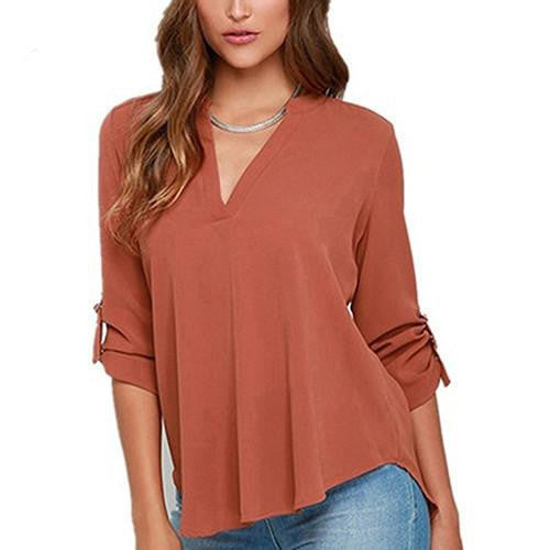 Whether you're going to work, attending a casual outing, or enjoying a weekend brunch, the Women's Stylish V Neck Rollable Sleeve Loose Solid Chiffon Blouse Shirt is your go-to choice. Its simple yet stylish design makes it easy to dress up or down, providing endless outfit possibilities.
