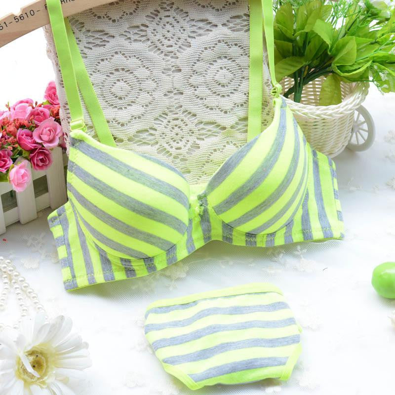 Introducing the Young girl stripe thin thick double breasted underwear bra set cute sexy green rose orange size AB 70-80 underclothes — the perfect blend of style, comfort, and functionality. Designed specifically for young girls, this bra set is not just an undergarment but a fashion statement that will elevate any wardrobe. The intricate striped pattern adds a touch of fun, while the gorgeous color options of green, rose, and orange ensure versatility and appeal.