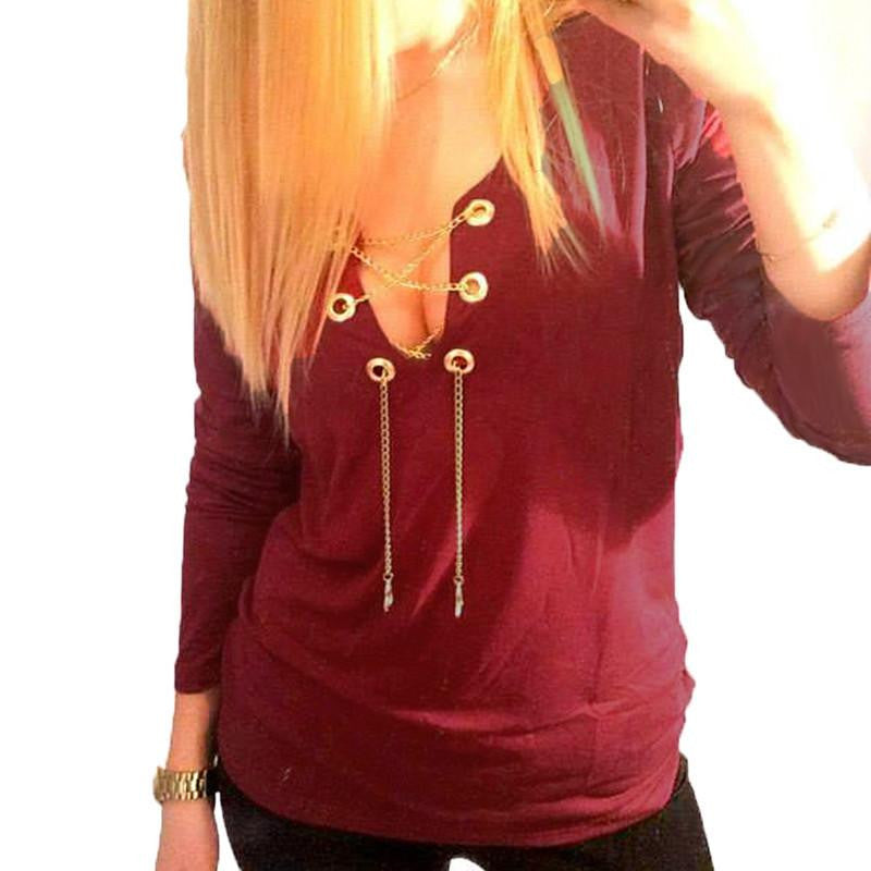 Whether you're dressing up for a night out or relaxing at home, the Women Women Deep V Neck Stretch Metal Chain Cotton Tee Tops Long Sleeve Solid Shirts will keep you looking stylish. With its breathable fabric and chic design, this top is a must-have for any fashion-conscious woman. Don’t miss out on the chance to enhance your wardrobe!