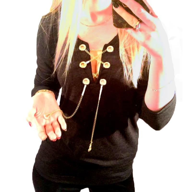Elevate your wardrobe with our Women Women Deep V Neck Stretch Metal Chain Cotton Tee Tops Long Sleeve Solid Shirts. This stunning piece perfectly combines style and comfort, making it an essential addition to your collection. Crafted with a blend of high-quality cotton and polyester, this tee offers a soft touch against your skin while providing the stretch you need for all-day wear.