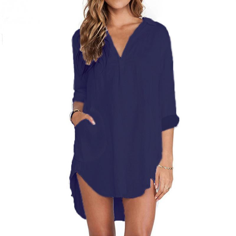 Whether you're heading to a brunch date, a casual workday, or enjoying a night out, this Women See Through Chiffon Shirts Dress Long Sleeve Pocket Casual Blouse Tops Plus Size XS-6XL will make you stand out. Pair it with leggings, jeans, or a skirt for versatile styling options.