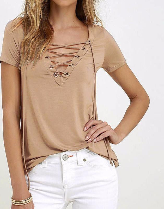 Introducing the ultimate wardrobe essential - the Women V Neck Blouses Short Sleeve Casual Hollow Out Lace Up Solid Shirts Tee Tops. This stunning blouse is designed to elevate your casual style while ensuring all-day comfort. Crafted from high-quality cotton fabric, it features a breathable and soft texture, making it perfect for any occasion.